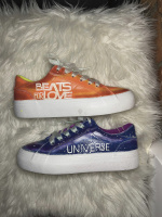 Nápisy Beats for Love a Universe, zvuková vlna a motiv galaxie.