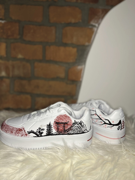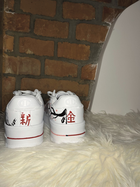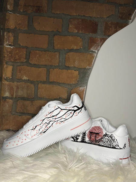 Na druhé botě sakurová větev – jemnost v kontrastu se silou.