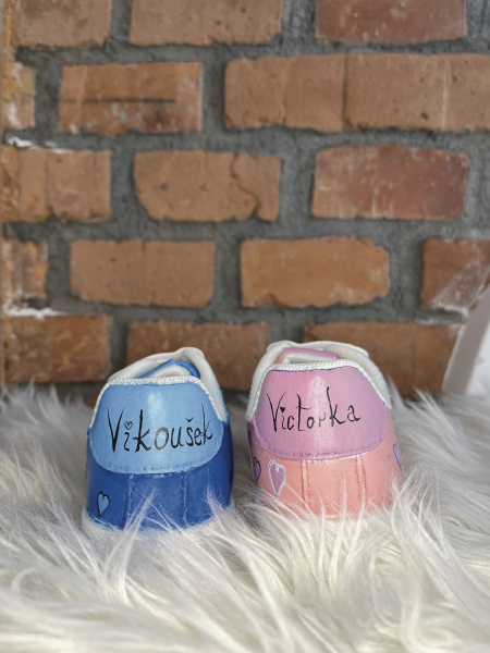 Jemné srdíčkové detaily, kontrast barev a jména na přání.