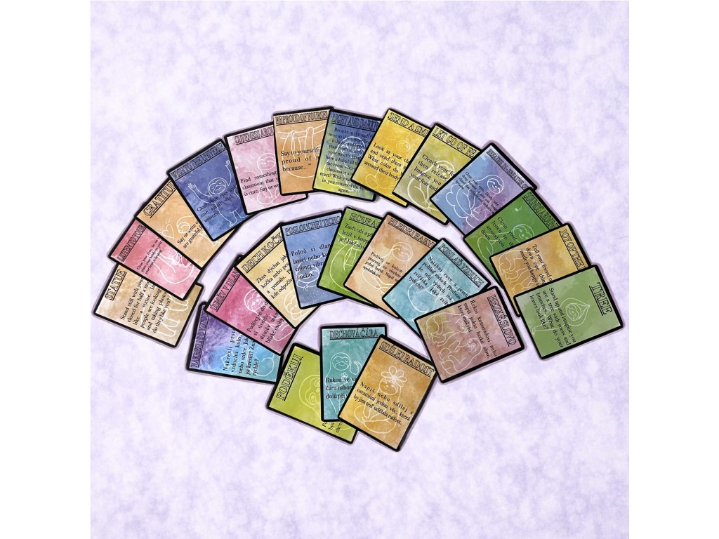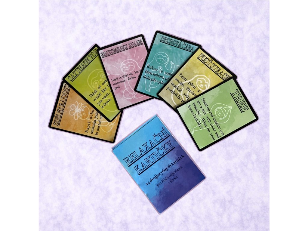 Každá kartička je ručně kreslená a oboustranná. Na jedné straně je česká verze, na druhé anglický překlad. Díky tomu lze kartičky využít nejen k relaxaci, ale také k nenápadnému rozvoji jazykového vnímání a práce s jednoduchými pokyny v obou jazycích.